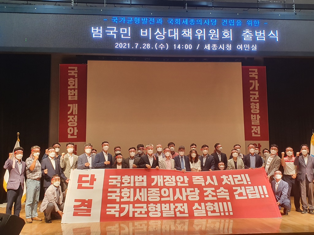 (가칭) 국가균형발전과 국회세종의사당 건립을 위한 범국민 비상대책위원회 창립대회 및 출범식 -일시 : 2021. 7. 28(수) 13:00~13:30(창립대회) / 14:00~15:00(출범식) -장소 : 세종시청 여민실 -내용 <창립대회> 안건의결 등 <출범식> 개회 비대위 창립 경과보고(성은정 대변인) 대회사(임승달 상임대표) 연대사(이춘희 세 종특별자치시장, 홍성국 세종(갑)국회의원, 이태환 세종특별자치시의회의장, 유철규 세종특별자치시의회 행정수도완성특별위원회 위원장, 김안제 전)신행정수도건설 추진위원장) 출범 선언문 낭독(김지헤 공동집행위원장, 이비환 전)고려대학교 세종캠퍼스 총학생회장 국회법 개정안 처리 촉구 퍼포먼스
