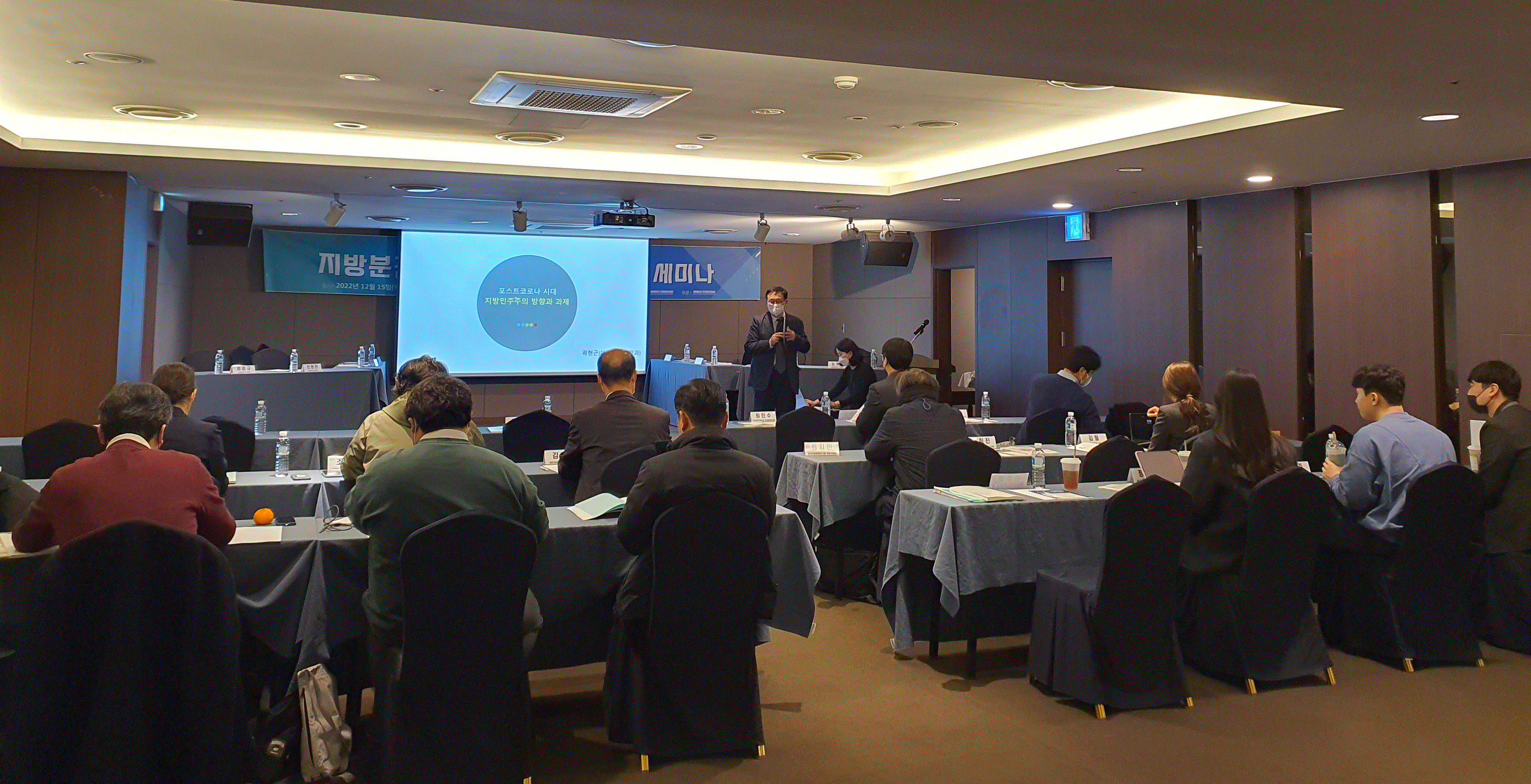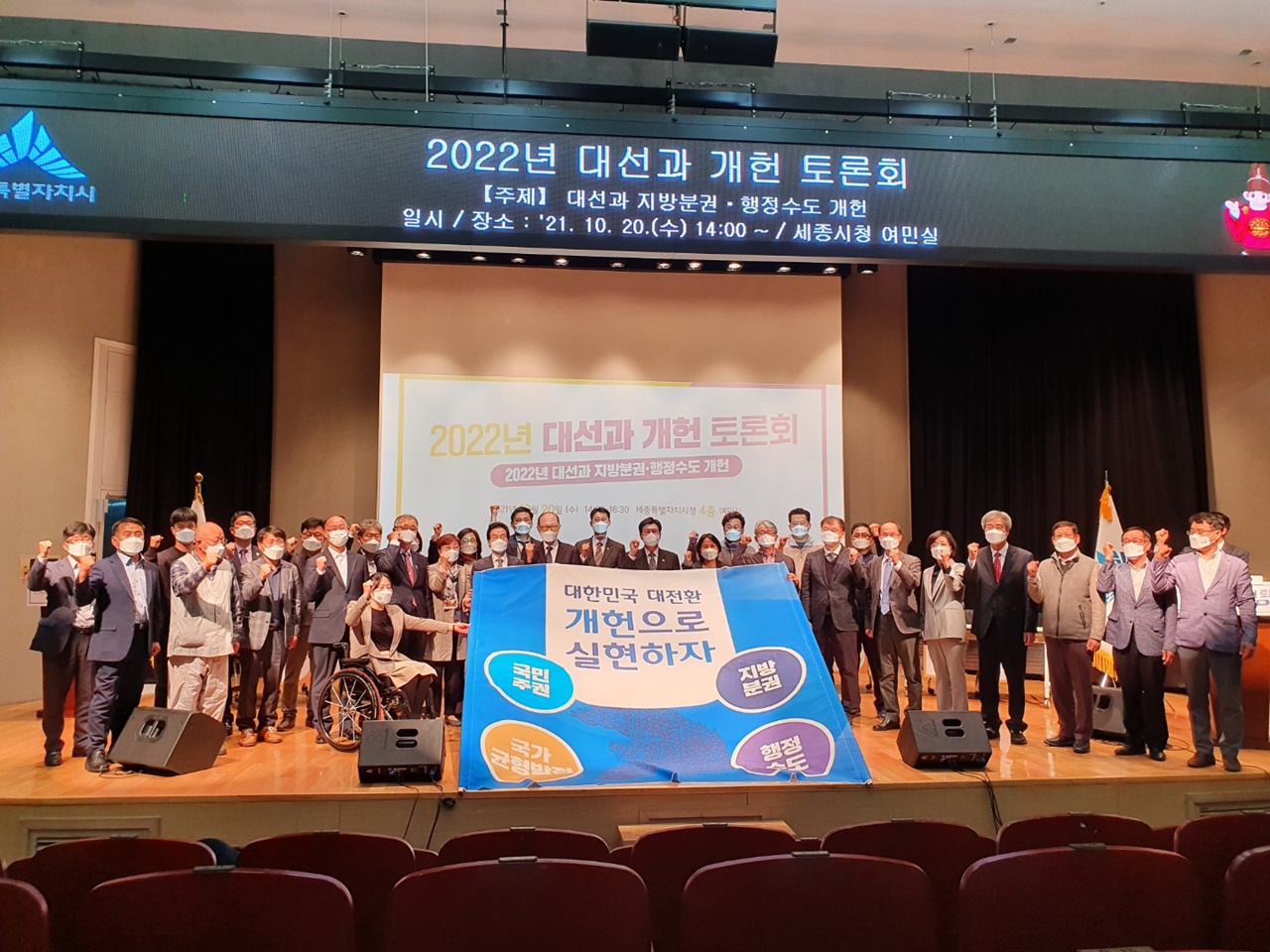 <2022년 대선과 개헌 토론회> 주제 : 2022년 대선과 지방분권 · 행정수도 개헌 일시 : 2021. 10. 20(수) 14:00~16:40 장소 : 세종특별자치시청 여민실 발표 -김중석(강원도민일보 사장) -박진완(경북대학교 법학전문대학원 교수) 좌장 -이민원(전)대통령 직속 국가균형발전위원장) 토론 -김종익(상생나무 도시재생연구소 소장) -안권욱(지방분권경남연대 공동대표) -이두영(충북 국토균형발전 및 지방분권촉진센터장) -이재은(고양시정연구원장) -하승수(공익법률센터 농본 대표)