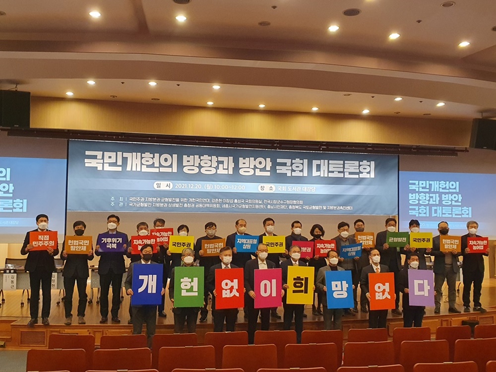<국민개헌의 방향과 방안 국회 대토론회> (일시) 2021. 12. 20.(월) 10:00~12:00 (장소) 국회 도서관 대강당 (주최) 개헌국민연대, 전국시장군수구청장협의회, 홍성국 국회의원실, 강준현 국회의원실, 이장섭 국회의원실 (주관) 세종시국가균형발전지원센터, 국가균형발전·지방분권·상생발전 충청권공동대책위원회, 충남시민재단, 충청북도 국토균형발전 및 지방분권촉진센터 (발제) 안성호_개헌국민연대 공동대표, 전)한국행정연구원장 (좌장) 이상수_전)노동부장관, 전)국회의원 (지정토론) 하승수_공익법률센터 농본 대표 하혜수_경북대학교 교수 김현우_기후위기비상행동 집행위원 초의수_신라대학교 교수 윤병선_건국대학교 교수 신정규_충북대학교 교수 김동근_전북대학교 교수 라미경_서원대학교 교수 정현호_한국청년정책학회 이사장